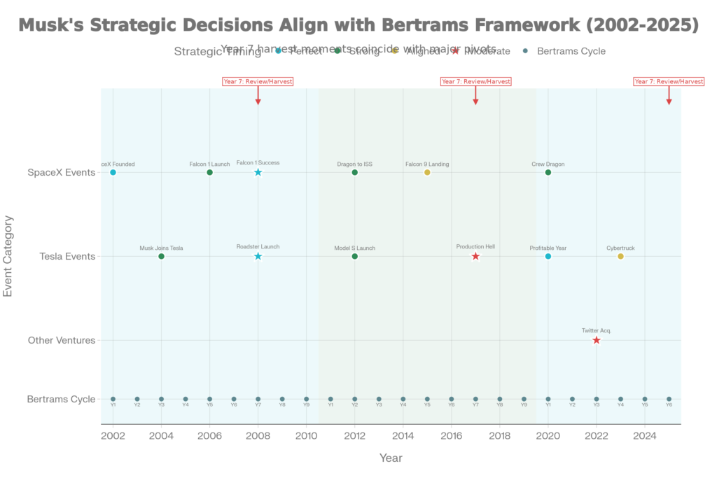 Strategic Timing Analysis: Elon Musk’s Business Decisions vs. Bertrams Pattern Recognition Framework (2002-2025). The visualization demonstrates remarkable alignment between Musk’s intuitive timing of major strategic moves and the Bertrams framework’s 7-9 year cycle recommendations, particularly during crisis points (Year 7) and renewal phases (Year 9/1)