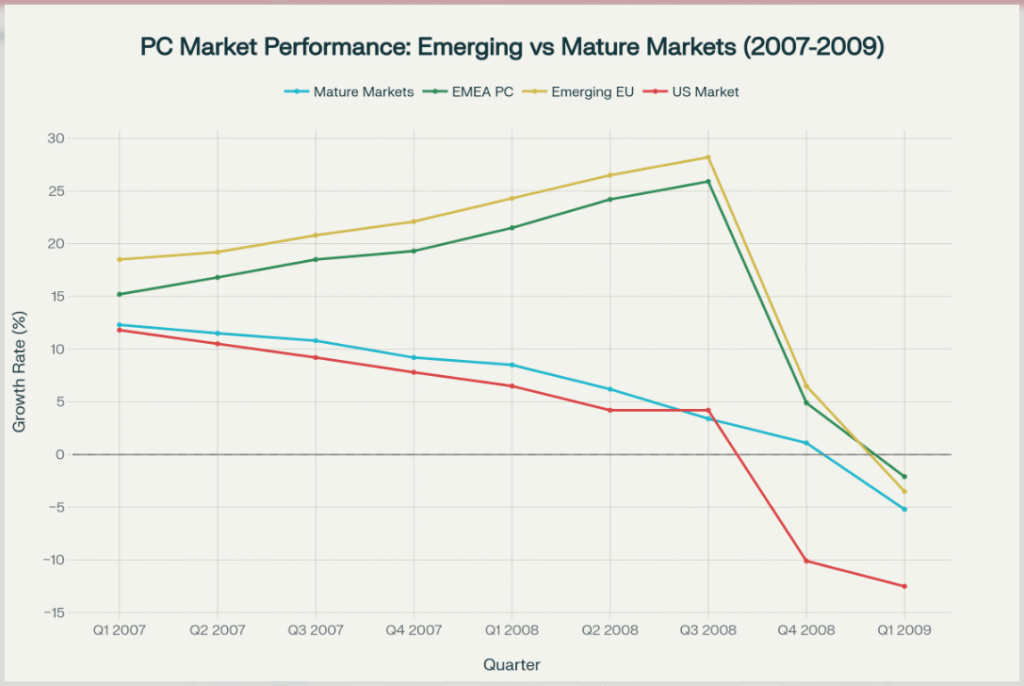 - The PC market in mature economies reflected this dynamic: US market growth decelerated from 11.8% in Q1 2007 to -12.5% by Q1 2009, while overall mature market growth collapsed from 12.3% to -5.2% over the same period.
